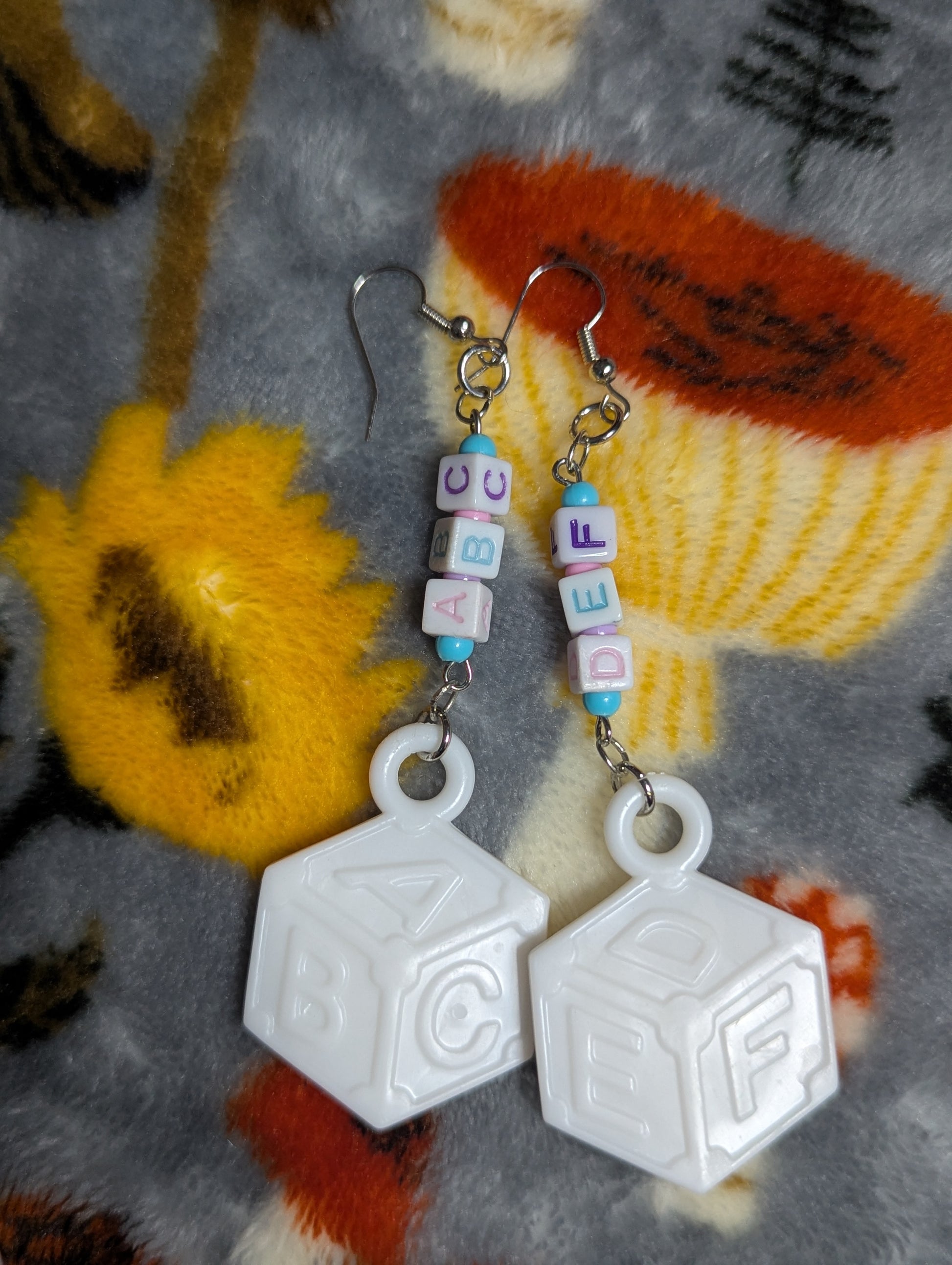 These earrings feature little plastic blocks, a carriage, and some cute beads to match! These are definitely cool statement earrings, perfect for kidcore or decora outfits!
